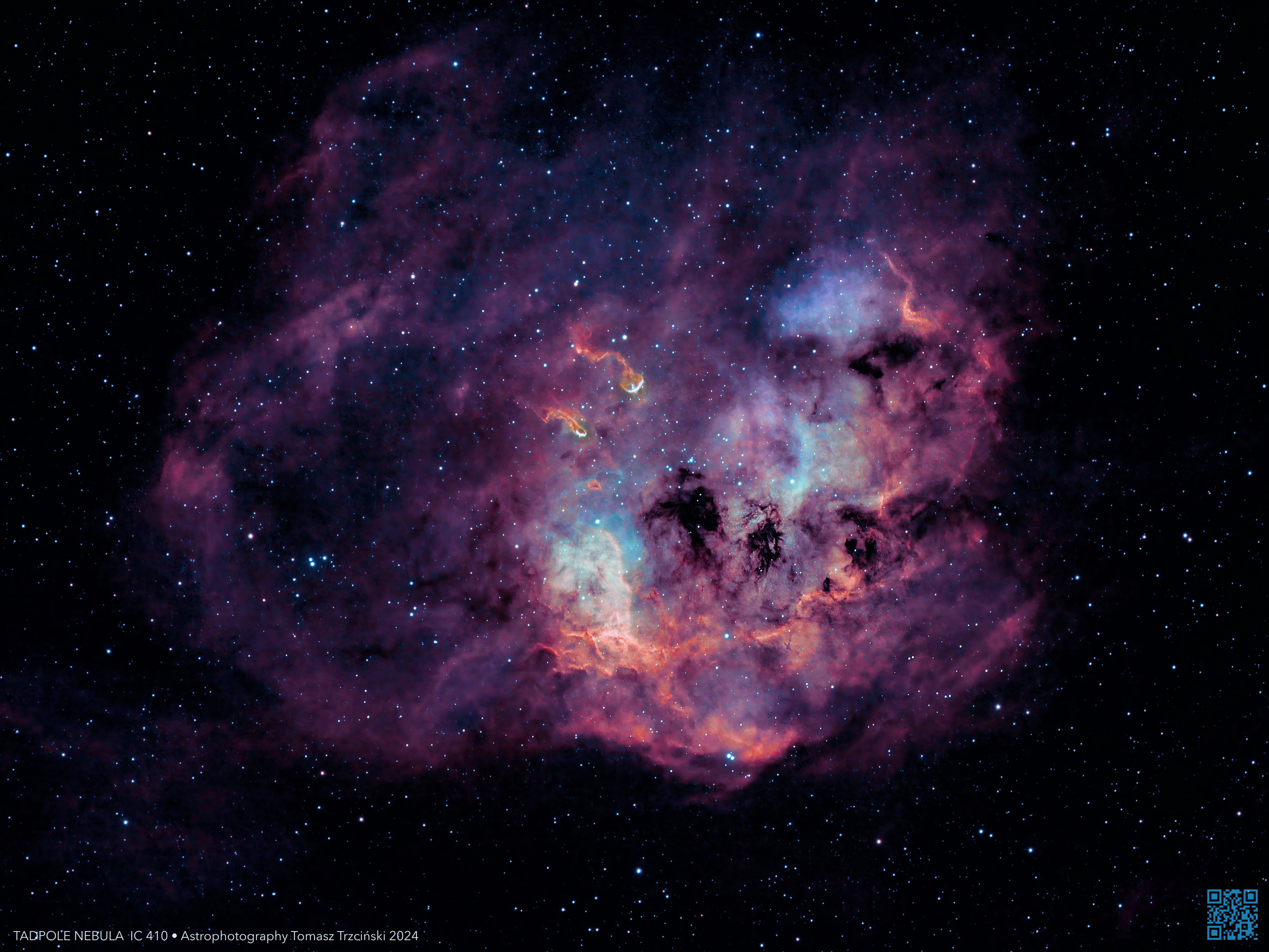 NASA „To teleskopowe zbliżenie ukazuje mgławicę emisyjną IC 410. Przedstawia również dwóch niezwykłych mieszkańców kosmicznego stawu gazu i pyłu powyżej i na lewo od środka - kijanki IC 410.Częściowo przesłonięta przez pył na pierwszym planie, mgławica otacza NGC 1893, młodą galaktyczną gromadę gwiazd.