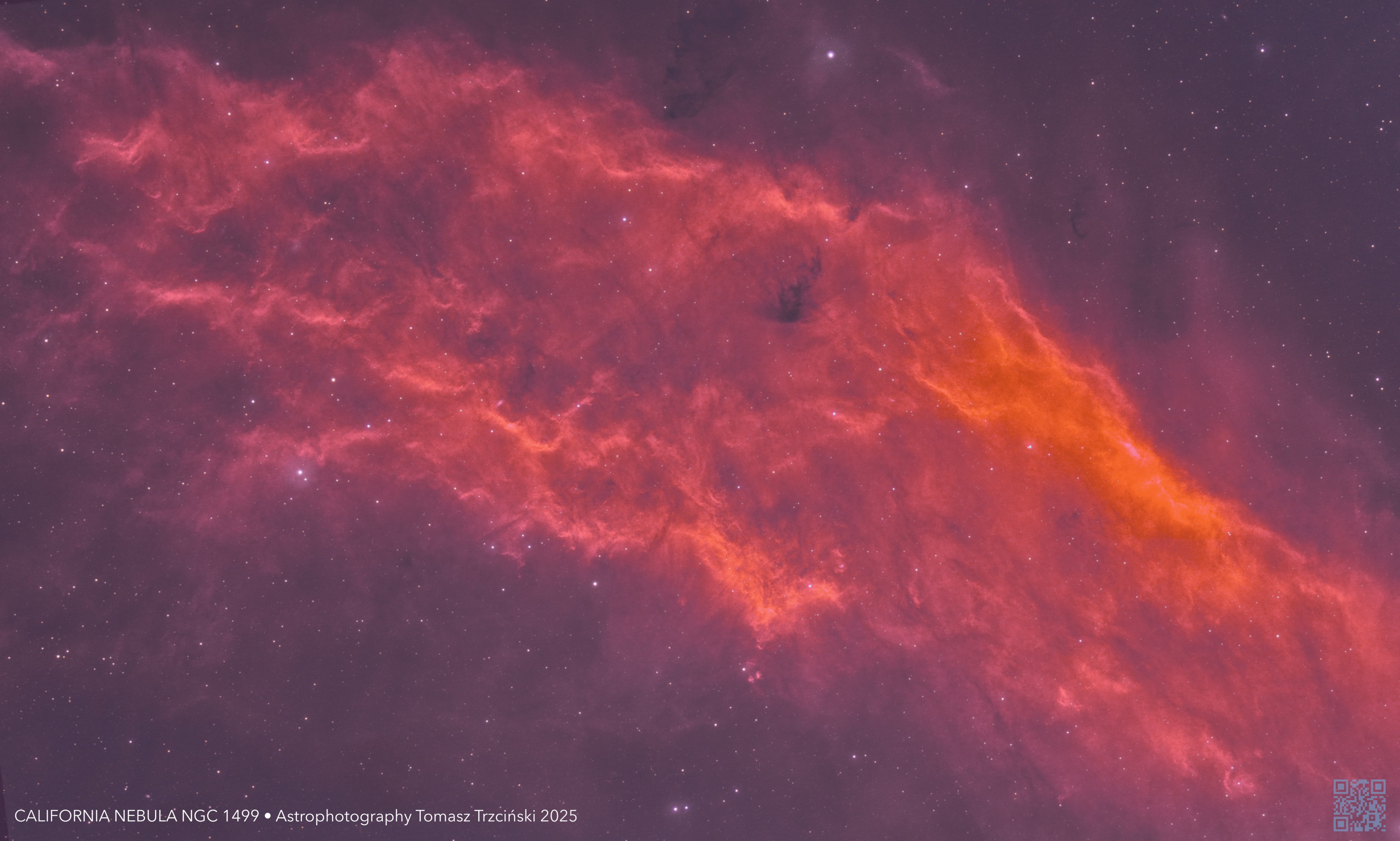 „Czy mityczna wyspa królowej Kalafii może istnieć w kosmosie? Być może nie, ale przypadkowo zarys tej molekularnej chmury kosmicznej przypomina zarys stanu Kalifornia w USA. Nasze Słońce ma swój dom w Ramieniu Oriona Drogi Mlecznej, zaledwie około 1000 lat świetlnych od Mgławicy Kalifornia. Znana również jako NGC 1499, klasyczna mgławica emisyjna ma około 100 lat świetlnych długości. Na prezentowanym zdjęciu najbardziej widoczną poświatą Mgławicy Kalifornia jest czerwone światło charakterystyczne dla atomów wodoru rekombinujących z dawno utraconymi elektronami, pozbawionymi (zjonizowanymi) przez energetyczne światło gwiazdy. Gwiazdą najprawdopodobniej dostarczającą energetycznego światła, które jonizuje większość gazu mgławicowego, jest jasna, gorąca, niebieskawa Xi Persei, znajdująca się na prawo od mgławicy. Mgławica Kalifornia jest regularnym celem astrofotografów i można ją dostrzec za pomocą teleskopu szerokokątnego pod ciemnym niebem w kierunku gwiazdozbioru Perseusza, niedaleko Plejad.”