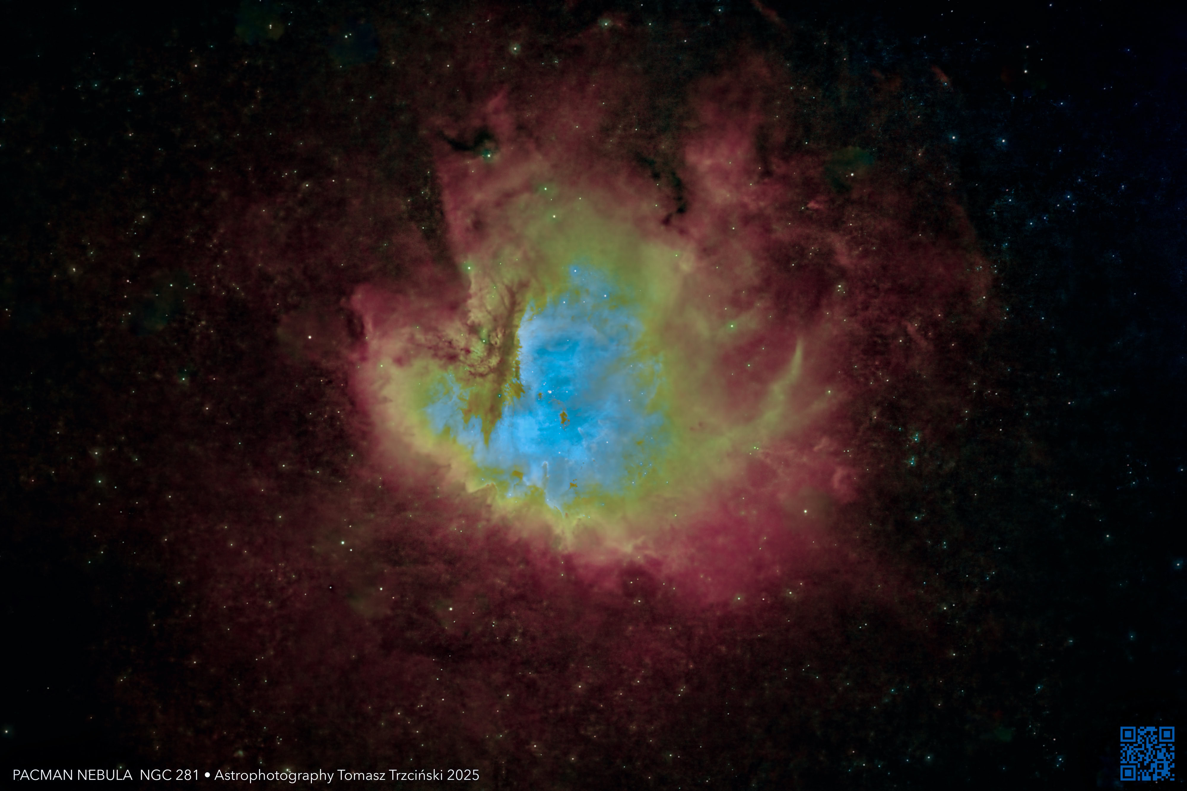 Wikipedia: NGC 281 (również Mgławica Pacman, Sharpless 184 lub IC 11) – obszar H II (również mgławica emisyjna) znajdujący się w konstelacji Kasjopei. Został odkryty 16 listopada 1881 roku przez Edwarda Barnarda. Znajduje się w odległości około 9500 lat świetlnych od Ziemi w ramieniu Perseusza. Mgławica ta jest klasycznym obszarem H II, oświetlanym przez młode gwiazdy uformowane w tej mgławicy. Obłok molekularny, z którego powstała mgławica od kilku milionów lat jest miejscem formowania się młodych masywnych gwiazd. Gwiazdy te należą do gromady IC 1590 znajdującej się powyżej centrum NGC 281. Gromada gwiazd obfitująca w nowe gwiazdy jest źródłem energii mgławicy. Wskazuje to na to, że proces tworzenia gwiazd trwa. Na pierwszym planie mgławicy widocznych jest kilka ciemnych globul Boka. W tych gęstych globulach obserwowanych w latach 90. XX wieku w podczerwieni odkryto protogwiazdy. Największa globula należąca do NGC 281 ma średnicę około 2,6 roku świetlnego.
