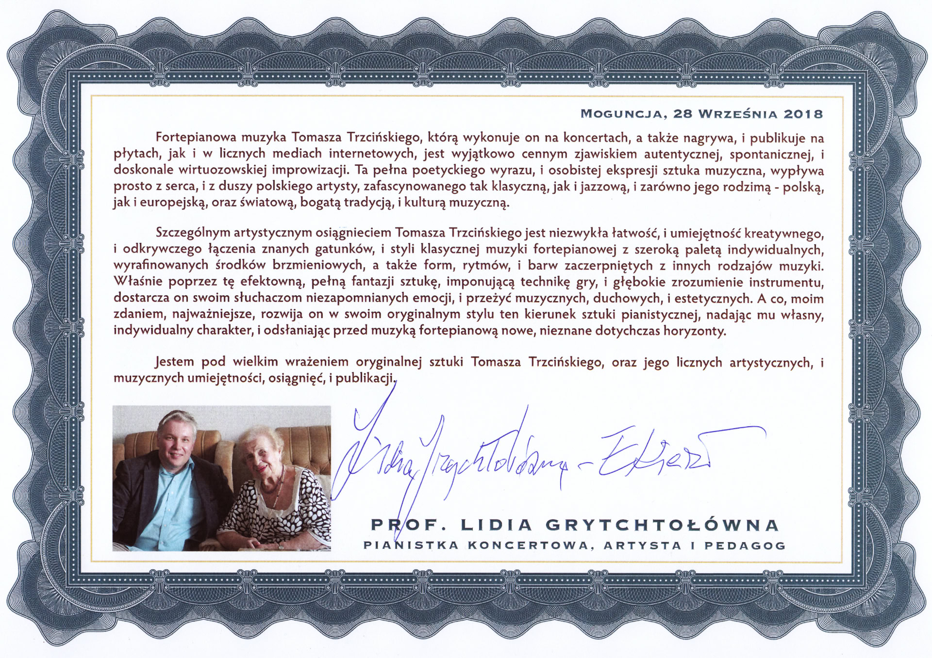 Jestem pod wielkim wrażeniem oryginalnej sztuki Tomasza Trzcińskiego, oraz jego licznych artystycznych, i muzycznych umiejętności, osiągnięć, i publikacji.”