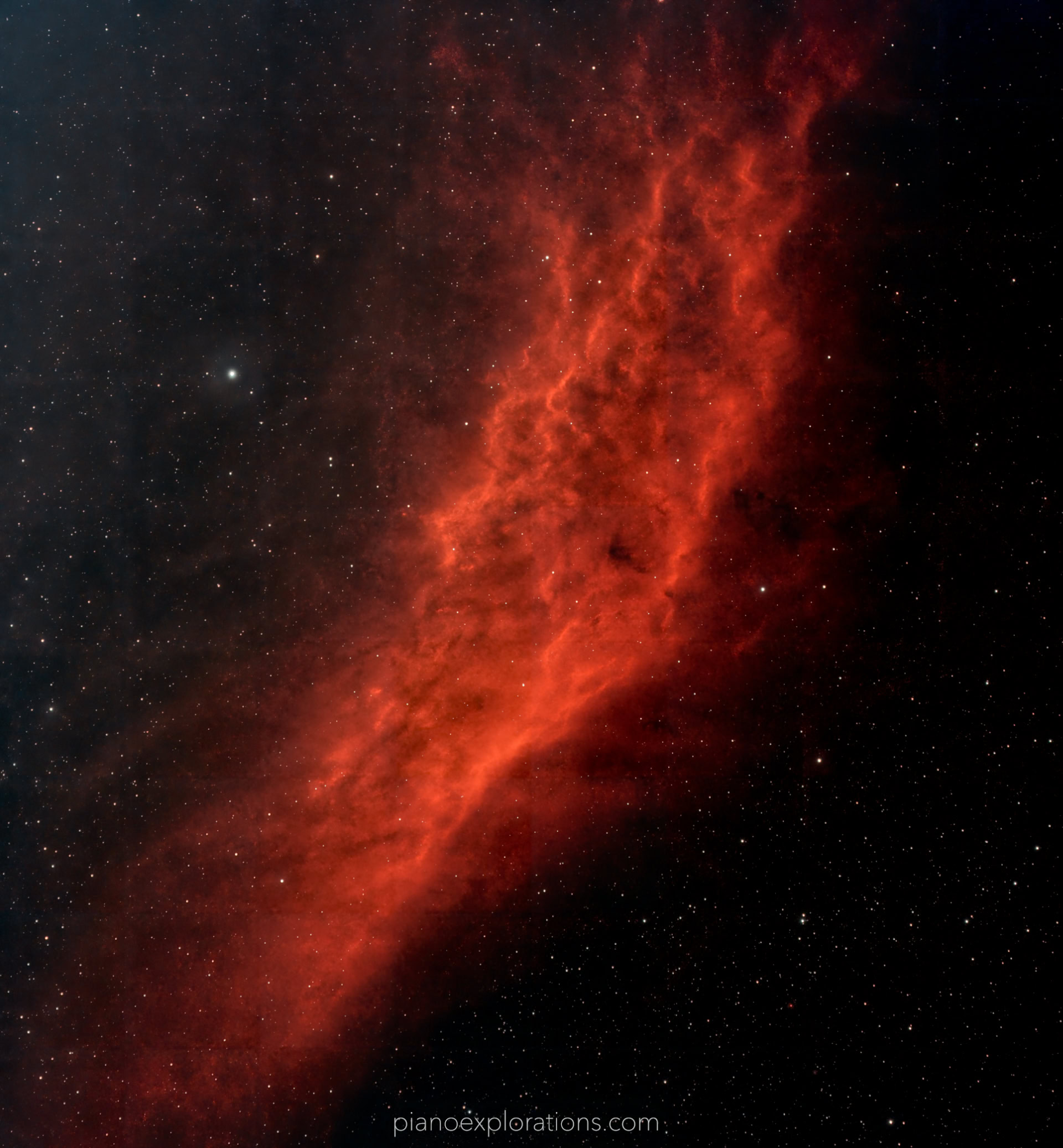 „Czy mityczna wyspa królowej Kalafii może istnieć w kosmosie? Być może nie, ale przypadkowo zarys tej molekularnej chmury kosmicznej przypomina zarys stanu Kalifornia w USA. Nasze Słońce ma swój dom w Ramieniu Oriona Drogi Mlecznej, zaledwie około 1000 lat świetlnych od Mgławicy Kalifornia. Znana również jako NGC 1499, klasyczna mgławica emisyjna ma około 100 lat świetlnych długości. Na prezentowanym zdjęciu najbardziej widoczną poświatą Mgławicy Kalifornia jest czerwone światło charakterystyczne dla atomów wodoru rekombinujących z dawno utraconymi elektronami, pozbawionymi (zjonizowanymi) przez energetyczne światło gwiazdy. Gwiazdą najprawdopodobniej dostarczającą energetycznego światła, które jonizuje większość gazu mgławicowego, jest jasna, gorąca, niebieskawa Xi Persei, znajdująca się na prawo od mgławicy. Mgławica Kalifornia jest regularnym celem astrofotografów i można ją dostrzec za pomocą teleskopu szerokokątnego pod ciemnym niebem w kierunku gwiazdozbioru Perseusza, niedaleko Plejad.”